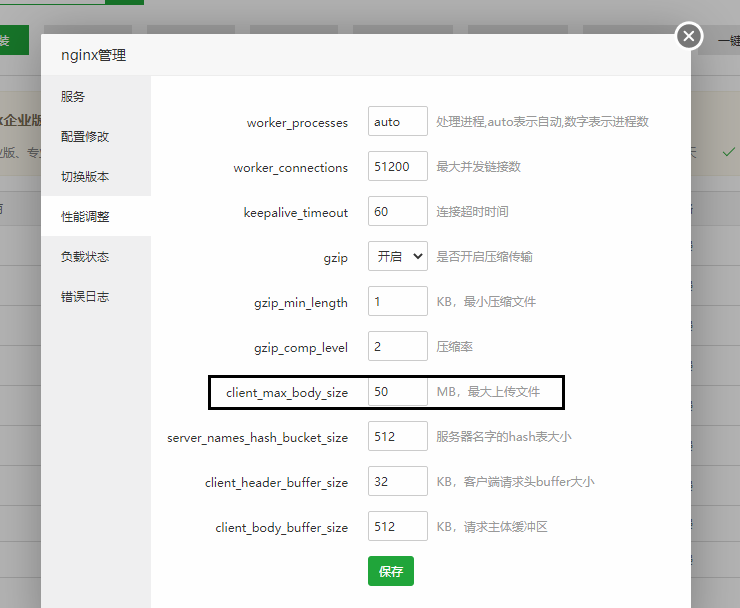 2.2:PHP修改完成后再修改Nginx,同样在软件商店-Nginx-性能调整-找到client_max_body_size将50更改为和PHP设置时一样的数值。