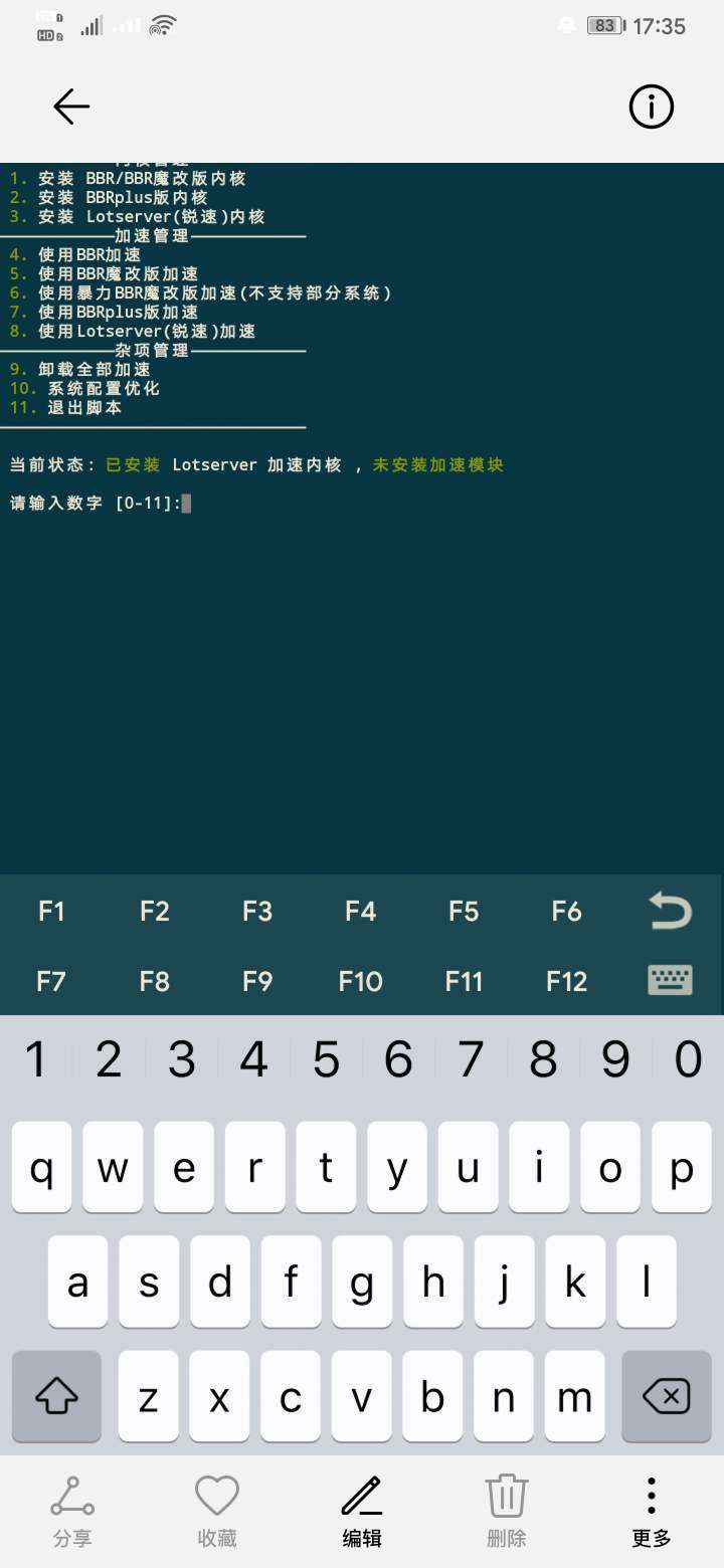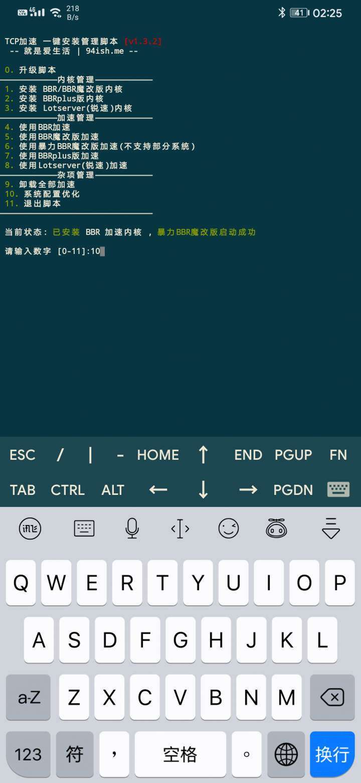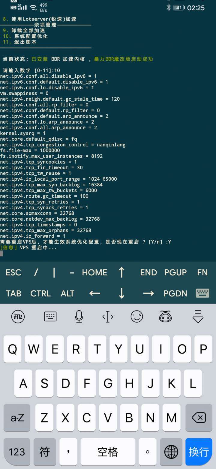 第四步:如果刚刚的加速脚本没有启动就多重复启动几遍☆重复刚刚的教程☆如果试了多次还是不行的话可能是系统不支持☆OVZ框架的云服务器不支持这个脚本☆可以自行百度支持ovz框架的bbr脚本☆或者跳过这一步☆第七步:重连服务器!使用BBR加速脚本来到这个界面[如图一所示]并输入数字”10″[如图一所示]点击回车键!等待配置完成[如图二所示]输入字母”Y”点击回车键!等待服务器重启!大约30秒!然后去V2ray客户端填上你可以免流的混淆!连接服务器!就可以奔放了!